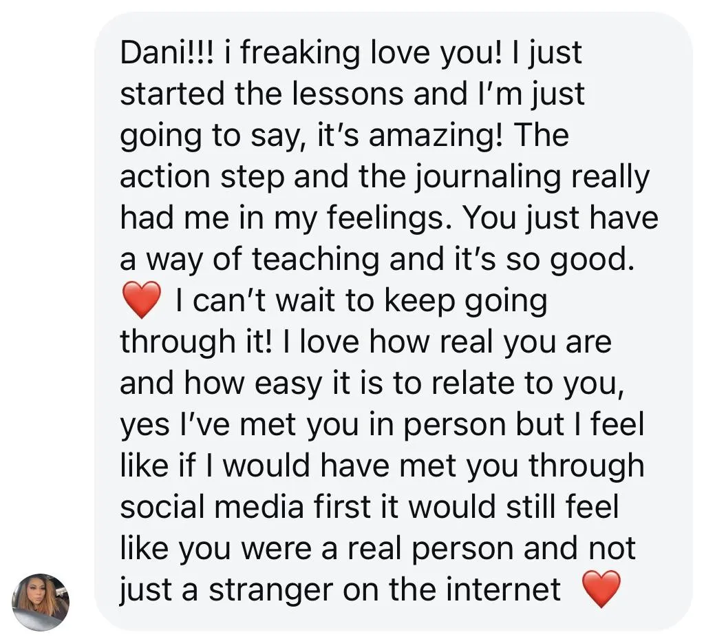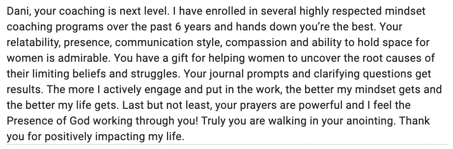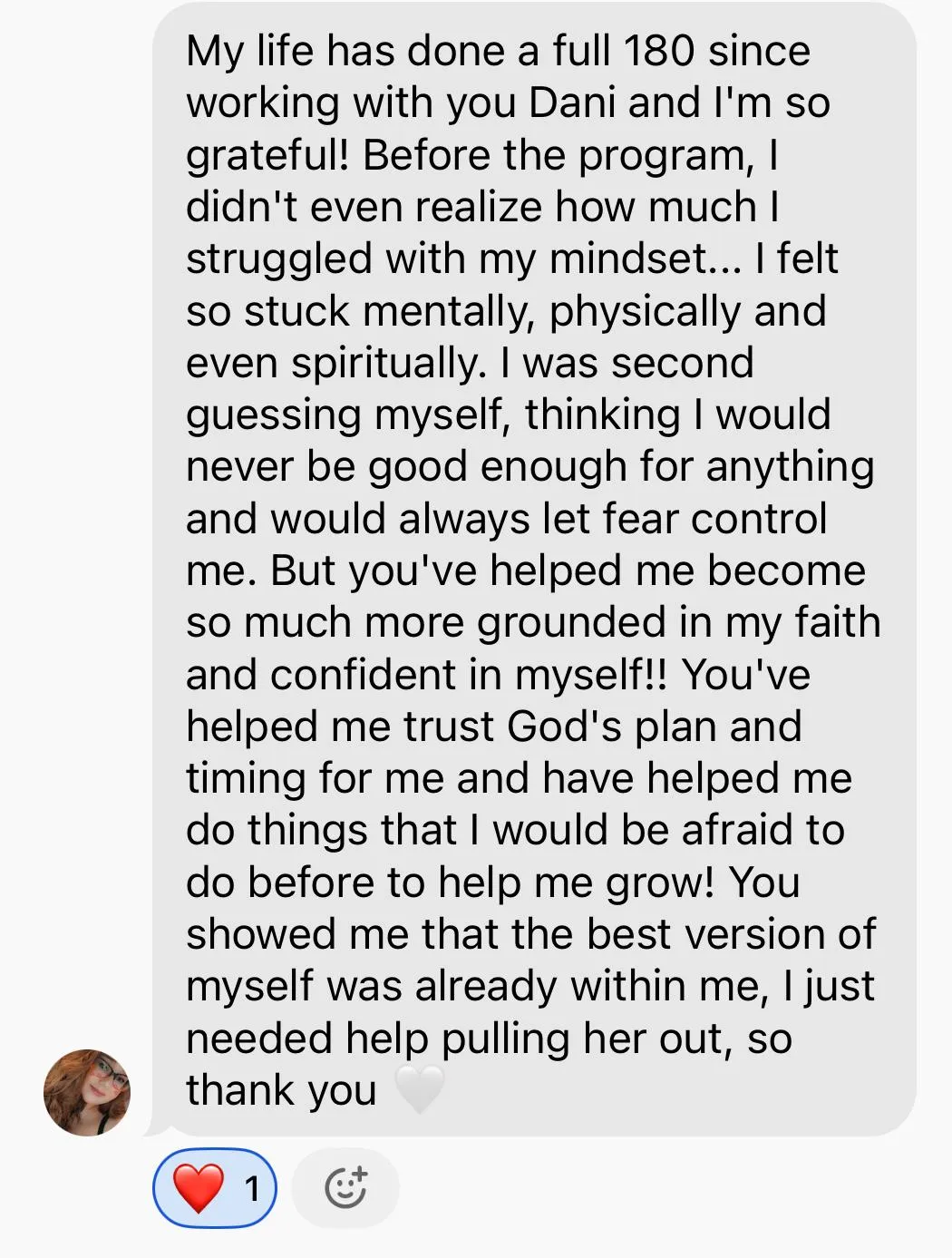 💌 A 24-year-old woman release shame from her past, walk away from an unequally yoked relationship, and now lead a 250K+ online ministry discipling 100+ women and hosting international retreats.